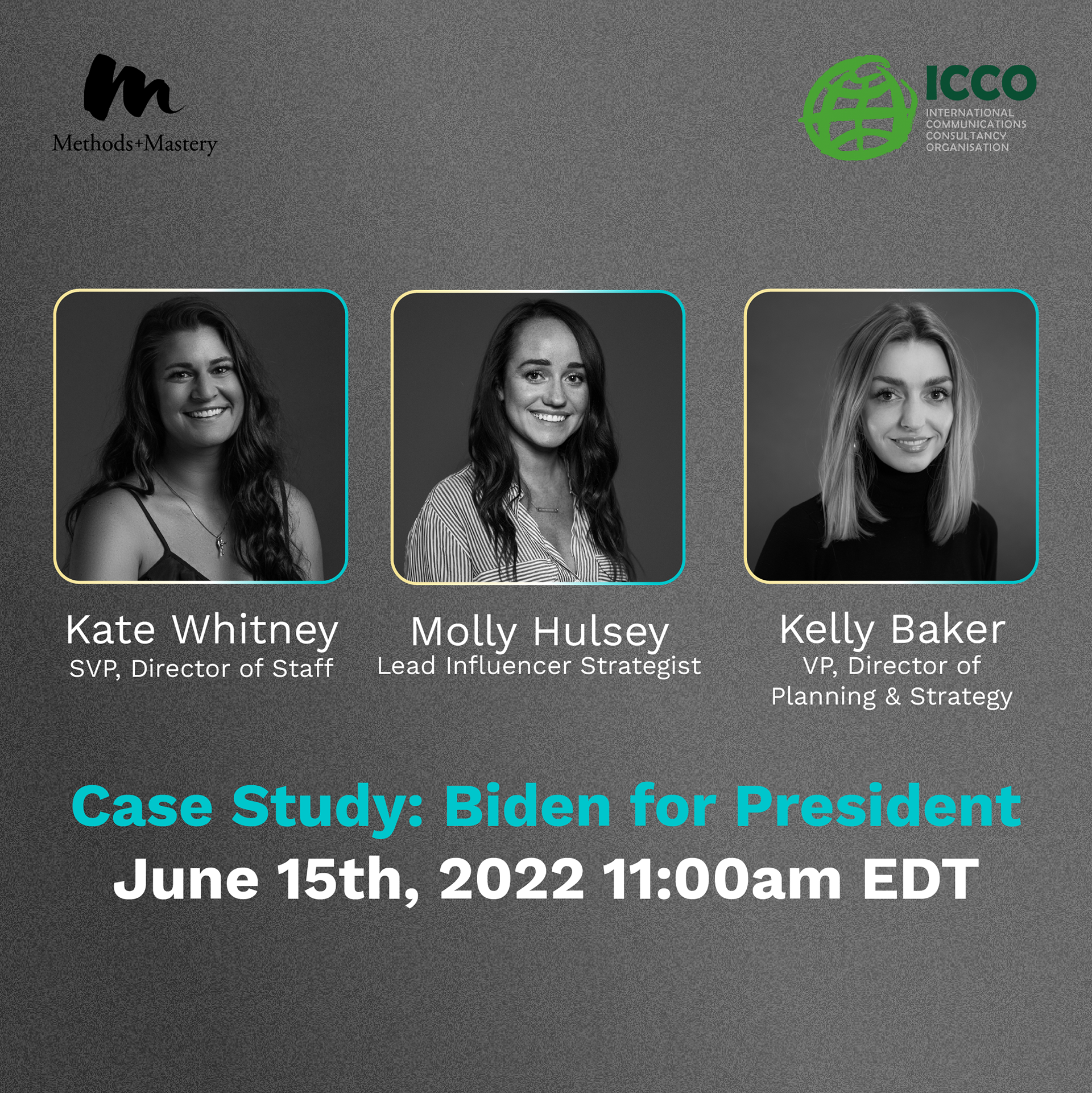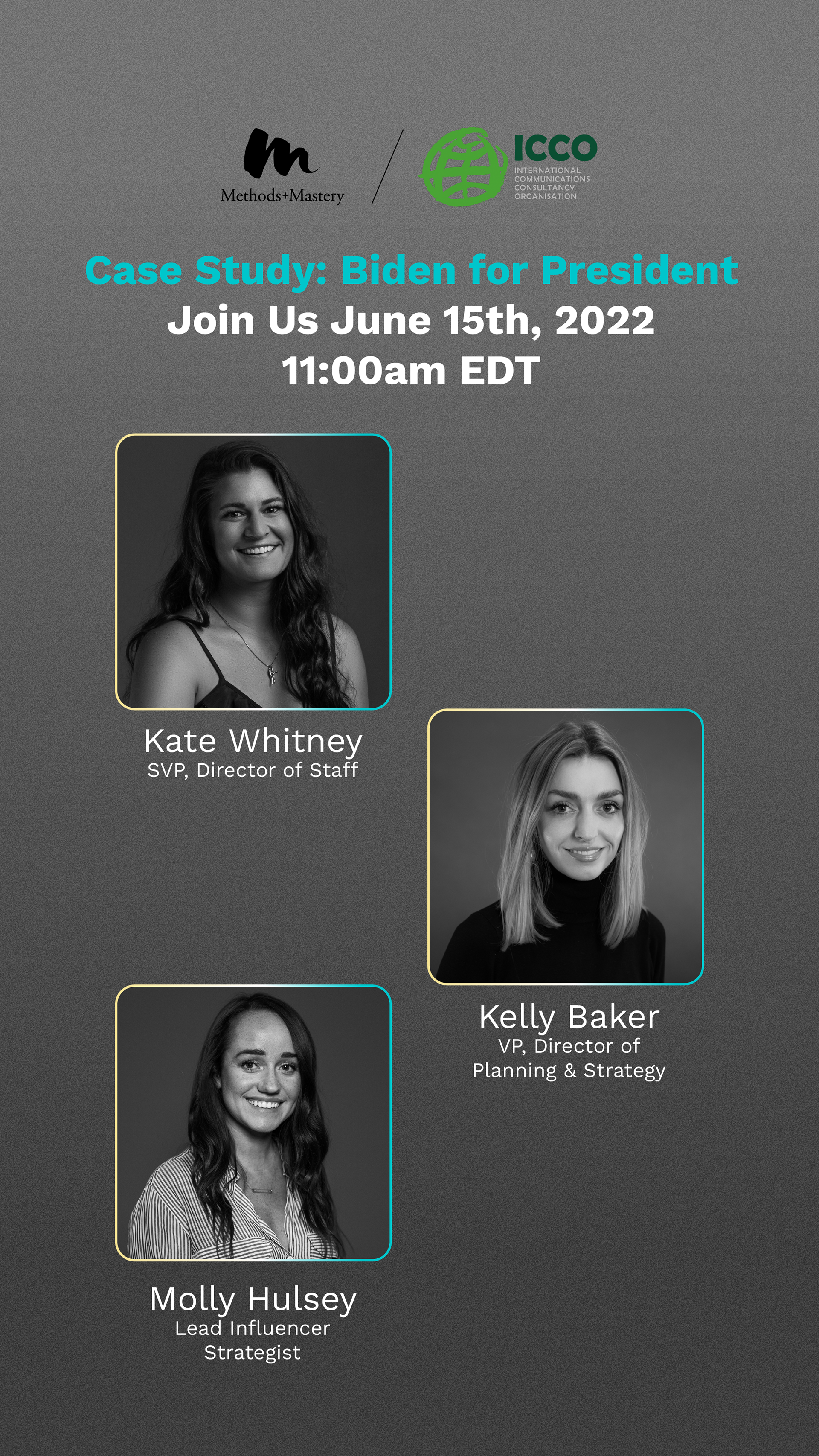 Promotional post for the ICCO Awards Masterclass for Biden for President featuring Methods + Mastery speakers.